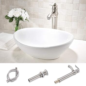Hlblfy Oval Bathroom Sink And Faucet Combo Oval Above Counter White Porcelain Ceramic Bathroom Vessel Sink Basin Washing Bowl Set Brushed Nickel Single Lever Faucet Matching Pop Up Drain Combo Amazon In Home