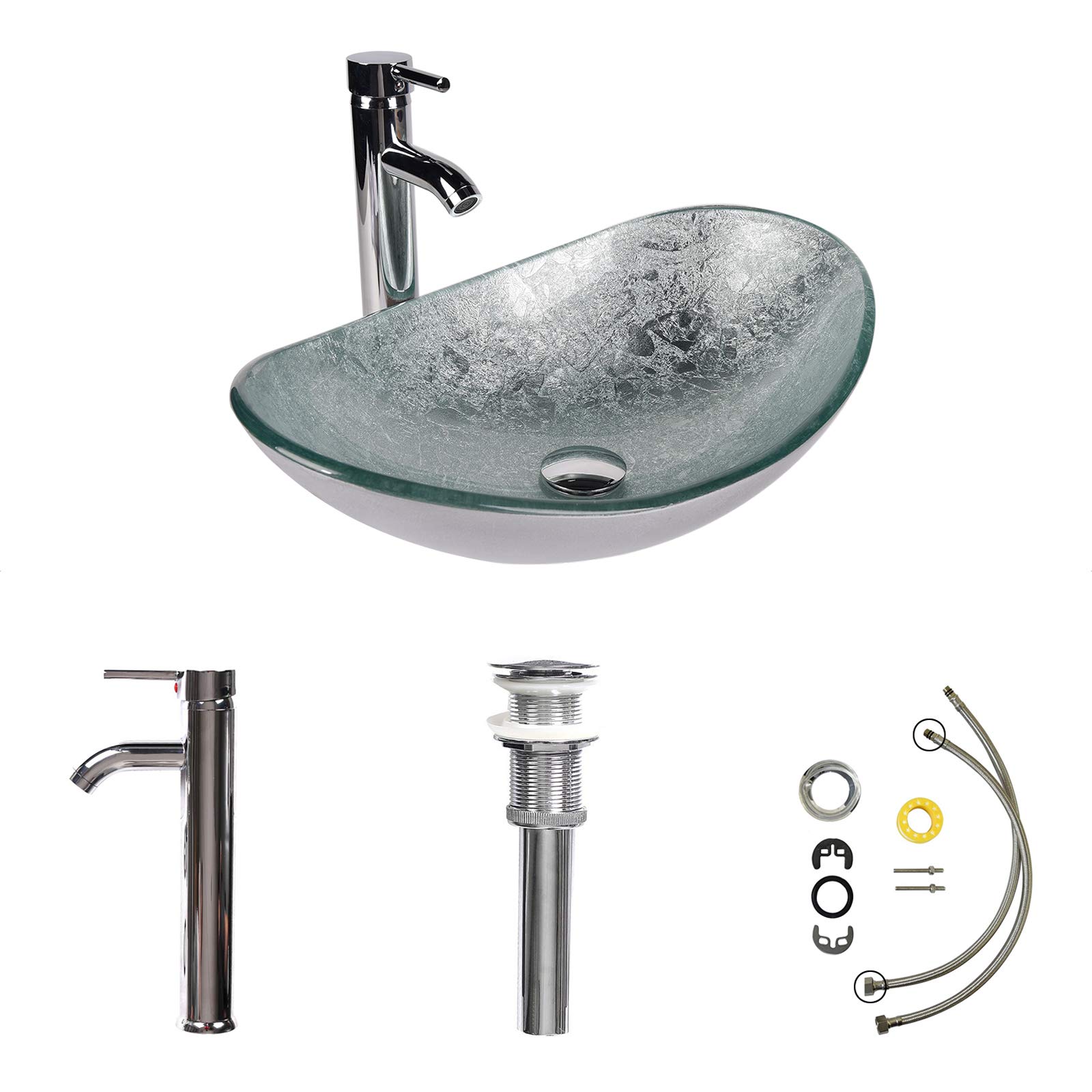 Bathroom Sink And Faucet Combo Artistic Tempered Glass Vessel Sink Basin Bowl Set Cabinet Countertop Sink With Chrome Faucet Pop Up Drain And Water Pipe Lavatory Washroom Oval Silver Green Buy Online