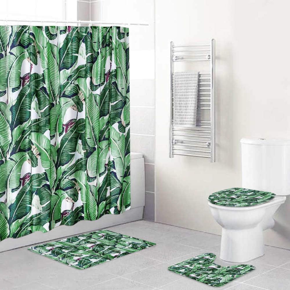 Lisumal Bathroom Curtains Rugs Set Of 4 Amazing Exotic Rainforest Banana Leaf Shower Curtain Bath Floor Mat Set Shower Curtain Pedestal Rug Toilet Seat Cover Bath Mat Anti Slip Waterproof Home Kitchen Bathroom Accessories